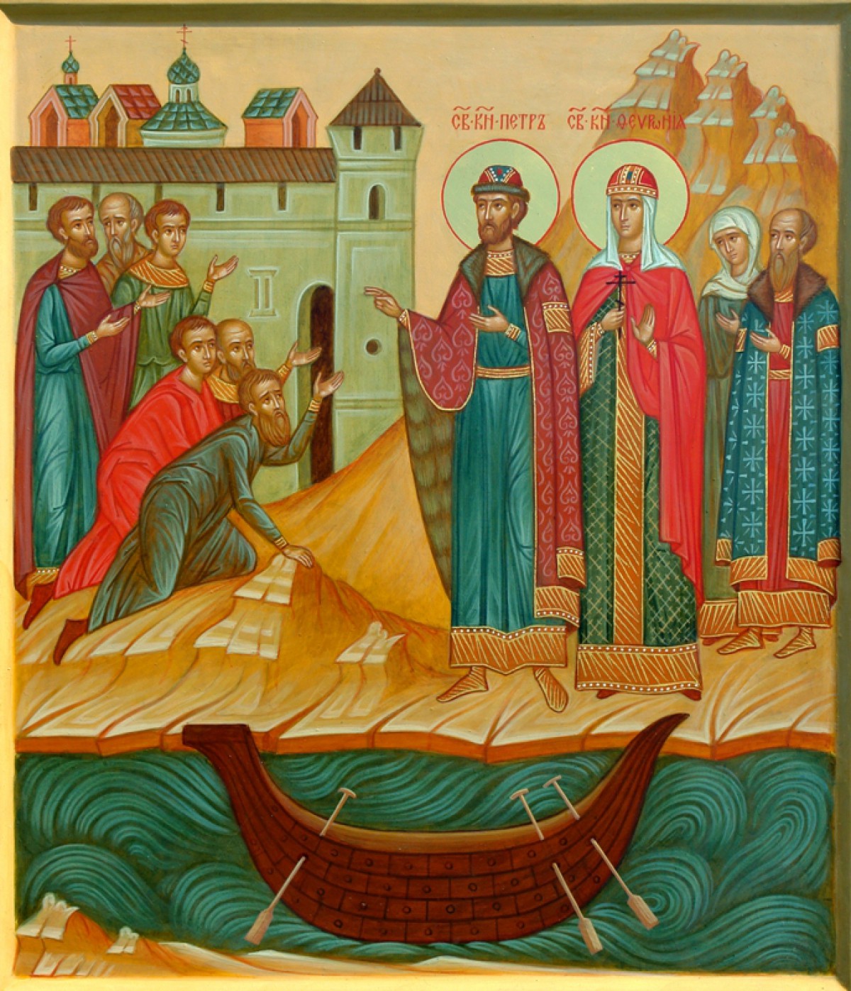 Яко благочестиваго корене пречестная отрасль был еси,/ добре во благочестии пожив, блаженне Петре,/ тако и с супружницею твоею, премудрою Феврониею,/ в мире Богу угодивше, и преподобных житию сподобистеся./ С нимиже молитеся Господеви/ сохранити без вреда отечество ваше,// да вас непрестанно почитаем.Кондак благоверных князей