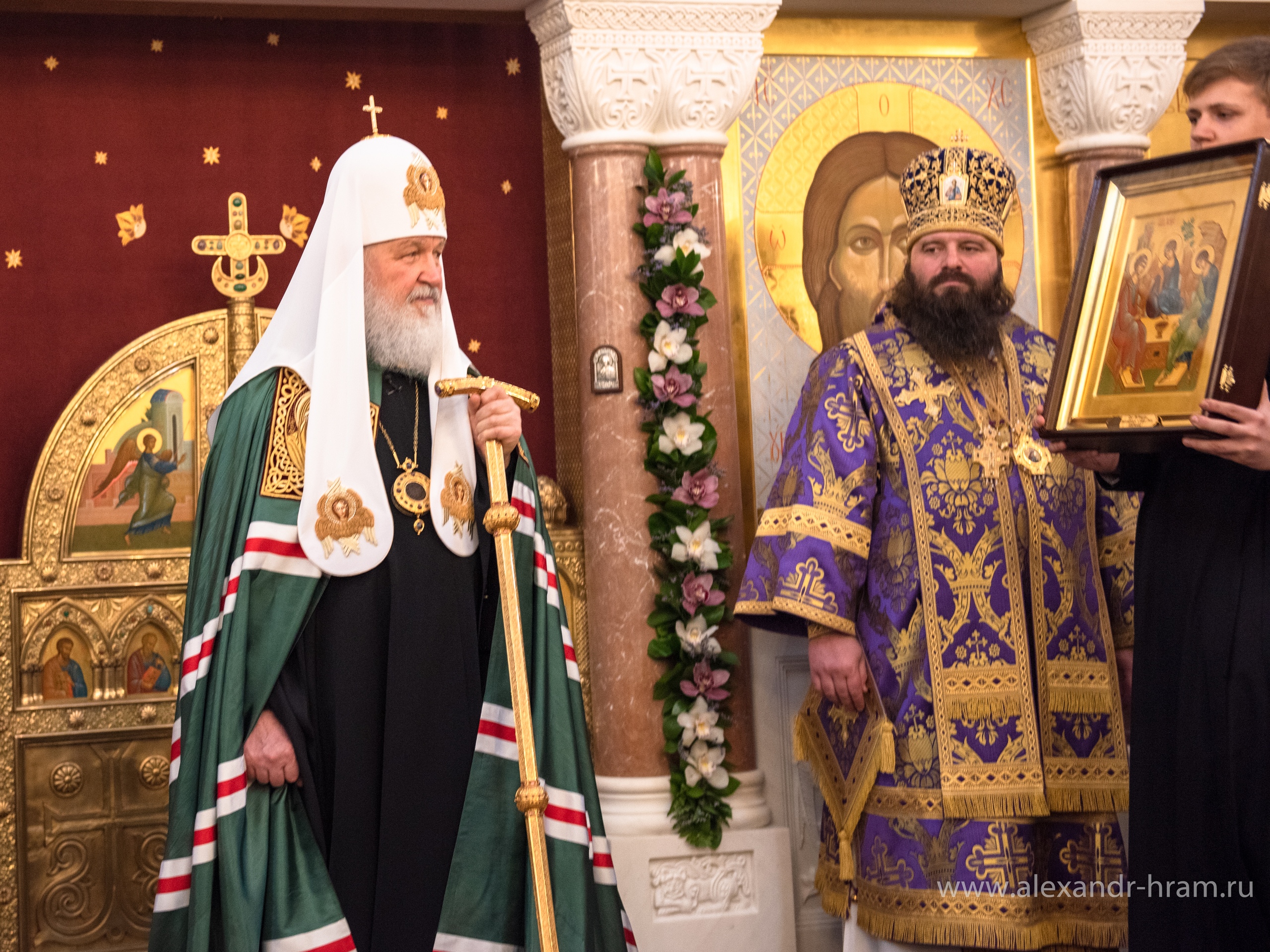 По окончании богослужения настоятель храма священник Максим Казаков приветствовал Святейшего Владыку и преподнес Его Святейшеству список храмовой иконы святого благоверного князя Александра Невского.